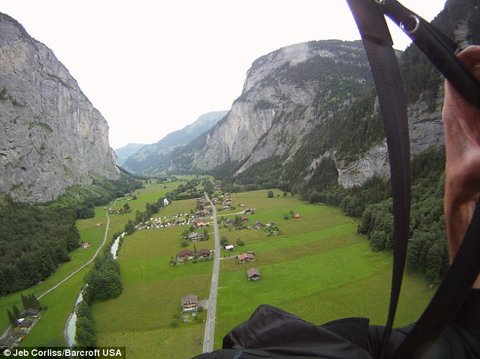 Soaring through the mountainous region of Lauterbrunnen, Switzerland, the 35-year-old flies within five feet of the 2,000ft sheer cliff wall.
